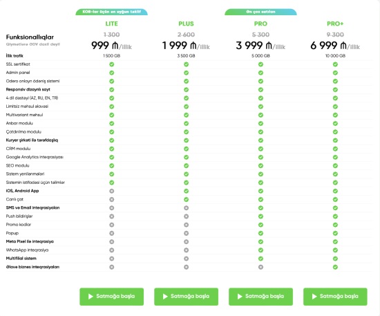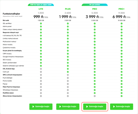 Ən populyar seçim olan “PRO” paketində Meta Pixel, WhatsApp inteqrasiyaları, SMS və Email push bildiriş kimi qabaqcıl marketinq və satış alətlərini təqdim edilir. Bu paket multifilial sistem dəstəyi ilə böyük ölçülü və daha mürəkkəb e-ticarət tələbləri olan bizneslər üçün mükəmməldir.