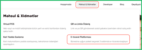 1. Öncə https://odero.az/ saytına keçid edib Məhsul & Xidmətlər bölməsində E-ticarət platformasını klikləyin.